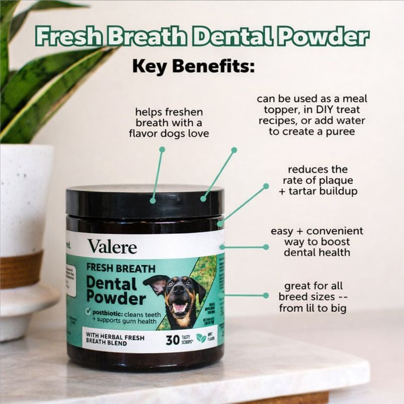 Daily habits and modern diets can take a toll on your dog’s oral health over time. Valere Fresh Breath Dental Powder is thoughtfully formulated to support a healthier mouth by helping manage plaque, tartar, and breath as part of a simple daily routine. Just sprinkle it onto food—no brushing, no chews, no stress. With consistent daily use, it fits seamlessly into mealtime, using a clean herbal blend and postbiotics to support fresher breath and better dental hygiene you can feel confident giving every day. ✨